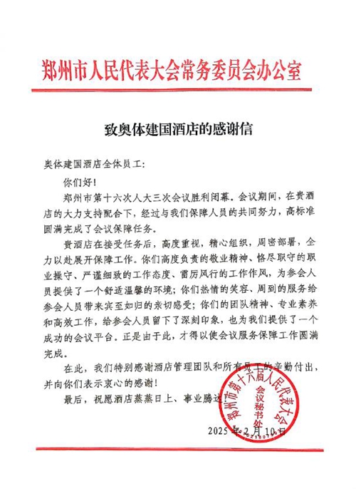 2025年2月10日,鄭州市第十六屆人民代表大會第三次會議第二次全體會議勝利閉幕。鄭州城市發(fā)展集團旗下河南鄭地奧體建國飯店作為本次大會的駐地保障酒店,以“五星”服務(wù)標(biāo)準(zhǔn)(環(huán)境舒心、食宿貼心、細(xì)節(jié)暖心、保障安心、文化潤心),圓滿完成了各項接待任務(wù),贏得了與會代表和會務(wù)組的一致好評。