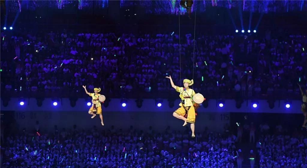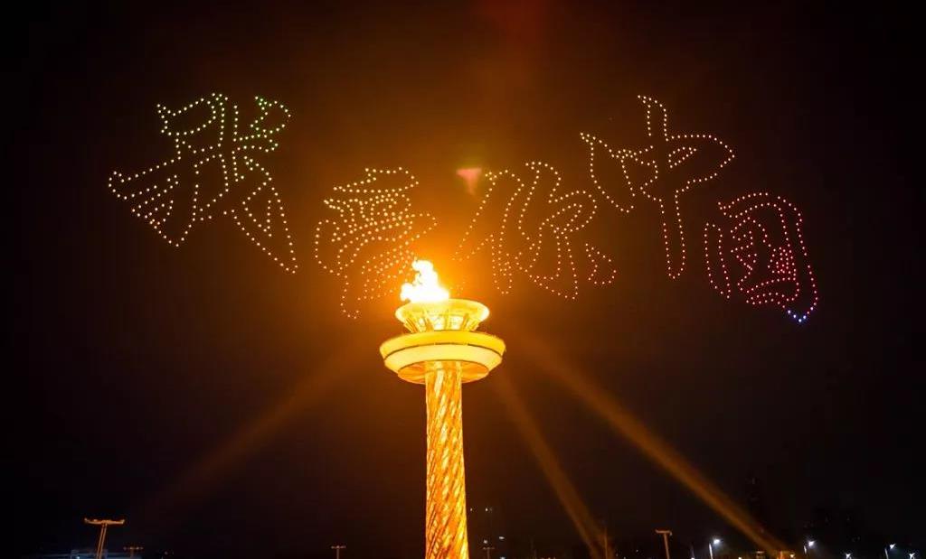 當(dāng)現(xiàn)場屏幕通過虛擬技術(shù)應(yīng)用,呈現(xiàn)出美麗的畫面,讓現(xiàn)場觀眾仿佛置身北國北川、南嶺飛瀑之中,觀眾都情不自禁地?fù)]舞起了手中的國旗為他們的表演喝彩!為我們偉大的祖國喝彩!1000架無人機從奧體中心廣場升起迅速變換成中中的造型,點燃民族運動會的火炬。